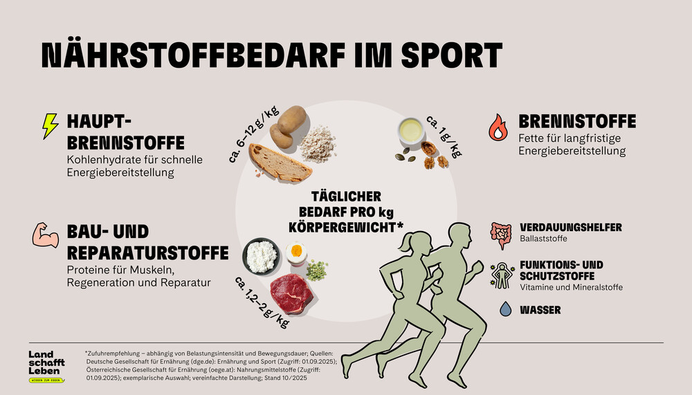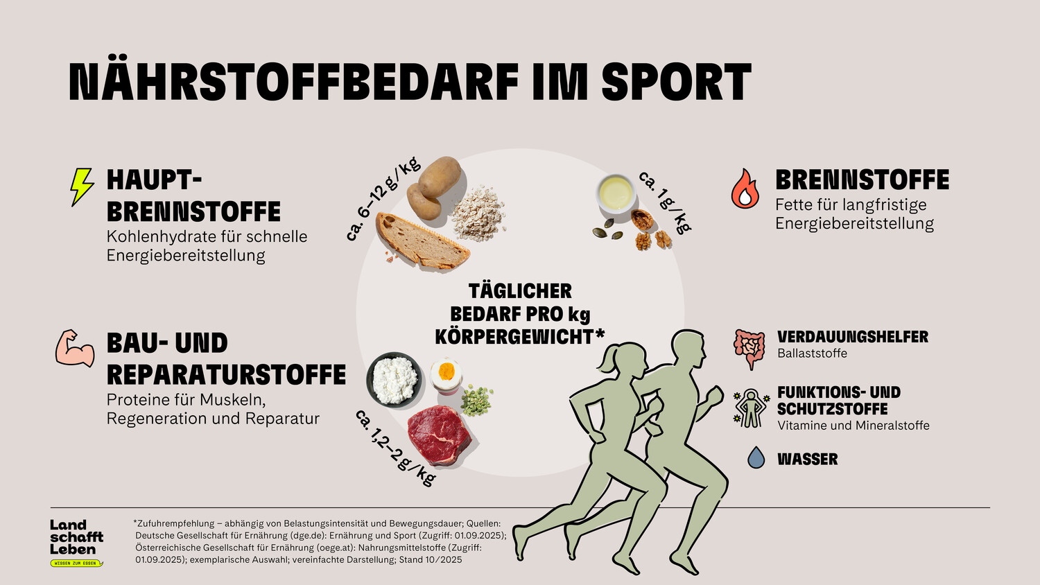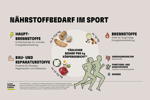 Kohlenhydrate sind die bevorzugten Hauptbrennstoffe in der Sporternährung: Sie liefern schnell Energie und ermöglichen etwa die Leistungsfähigkeit der Muskeln bei sportlichen Aktivitäten. Für die Arbeit des Gehirns und des Zentralnervensystems sind Kohlenhydrate ebenso eine wichtige Energiequelle – sie tragen außerdem zur Sättigung bei und beeinflussen den Blutzuckerhaushalt. Kohlenhydrate werden in einfache und komplexe Kohlenhydrate unterteilt. Einfache Kohlenhydrate sind vor allem Fruchtzucker (Fructose) und Traubenzucker (Glukose), also Einfach- und Zweifachzucker. Sie kommen in Haushaltszucker, Honig, Weißbrot, Keksen und vielen anderen Lebensmitteln vor und liefern schnell verfügbare Energie. Kurz vor und nach körperlichen Belastungen sollte die Ernährung eher aus einfachen Kohlenhydraten, zum Beispiel in Form einer Semmel oder eines Fruchtriegels, bestehen. In der Alltagsernährung und Regenerationszeit sollten Sportlerinnen und Sportler darauf achten, komplexe Kohlenhydrate in die Ernährung einzubauen. Sie enthalten mehrere Zuckerbausteine und oft auch Ballaststoffe. Komplexe Kohlenhydrate stecken vor allem in Vollkornprodukten, Hülsenfrüchten und ballaststoffreichem Gemüse sowie Obst – wie zum Beispiel Erbsen und Grünkohl oder Heidelbeeren und Birnen – und geben Energie über einen längeren Zeitraum ab. Sie sättigen auch länger als einfache Kohlenhydrate. Schlussendlich werden sie alle im Körper in den Zuckerbaustein Glukose umgewandelt, der als Brennstoff für die Muskelarbeit dient. Kohlenhydrate können jedoch nur begrenzt im Körper gespeichert werden. Wird ihr Vorrat beim Sport aufgebraucht, lassen Leistung, Geschicklichkeit und Konzentration nach – dann wird es zunehmend anstrengend, Erschöpfung tritt ein und das Verletzungsrisiko steigt.