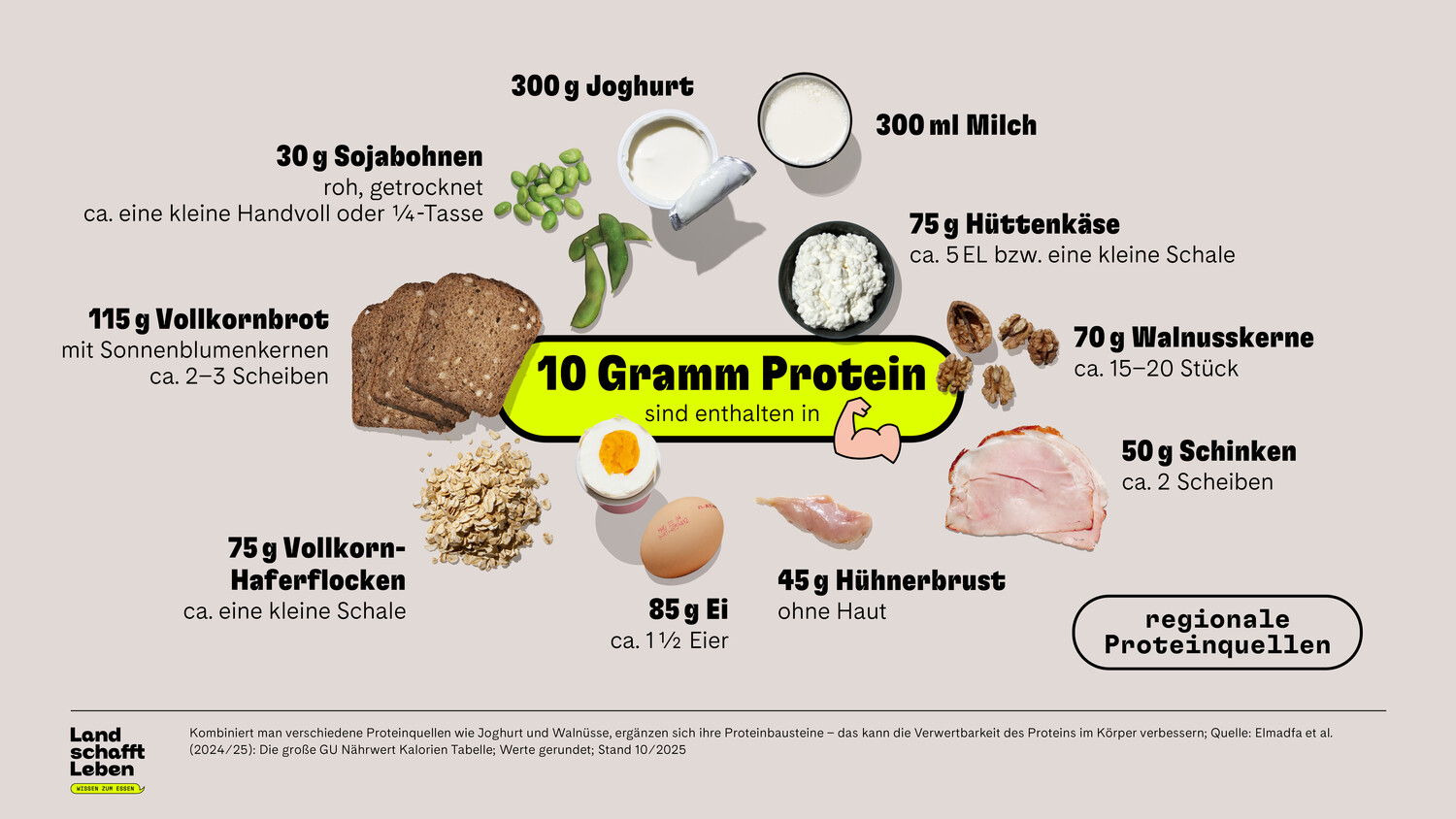 Nicht alle Nahrungsproteine eignen sich gleich gut zum Aufbau von körpereigenem Protein und damit als Bau- und Reparaturstoffe für menschliches Gewebe. Wie gut das Protein aus Lebensmitteln zur Bildung von körpereigenen Proteinen – zum Beispiel in Muskelmasse – genutzt werden kann, gibt die biologische Wertigkeit (BW) an. Als Referenz für die Bewertung dient dabei das Hühnerei: Seine BW wurde als 100 festgelegt. Bei einem Lebensmittel, dessen Protein schlechter verwertet wird als das aus dem Ei, sinkt die BW auf einen Wert unter 100. Es gilt: Je ähnlicher die Zusammensetzung eines Nahrungsproteins dem körpereigenen Protein ist, desto besser kann es verwertet werden. Besonders gut lassen sich Proteine aus tierischen Lebensmitteln wie etwa Milchprodukten, Eiern und Fleisch verwerten. Eine Kombination aus einer Vielfalt verschiedener Proteinquellen (wie einem Frühstück mit Eierspeise und Joghurt als erste Proteinmahlzeit des Tages) macht die Baustoffe für den Körper besonders gut nutzbar. Kombinationen aus Lebensmitteln erhöhen die BW und können den Gesamtwert einer Mahlzeit sogar über 100 steigern: Das kann z. B. eine Speise aus Kartoffeln (65 %) mit Ei (35 %) sein à BW 137, eine Mahlzeit aus Rindfleisch (77 %) und Kartoffeln (23 %) à BW 113 oder man probiert ein Rezept mit Ei (60 %) und Soja (40 %) à BW 122. Viele typisch österreichische Gerichte enthalten mehrere Proteinquellen, wie z. B.: Kartoffelgröstl mit Ei, Salzkartoffeln mit Ei und Spinat oder auch Rindsgulasch mit Kartoffeln. Hier bietet sich eine vielfältige Variation der verschiedenen, proteinhaltigen Lebensmittel unterschiedlichen Ursprungs an. Sie müssen nicht zwingend gemeinsam verzehrt werden: Der Körper kann die verschiedenen Proteinquellen auch dann in Kombination nutzen, wenn sie über den Tag verteilt aufgenommen werden – wie zum Beispiel ein Spiegelei zum Frühstück und ein Gericht mit Soja zum Mittagessen.