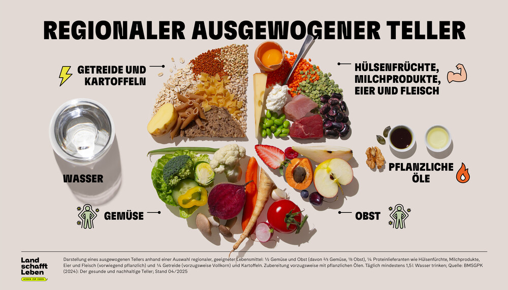 - Ein Viertel belegen proteinreiche Lebensmittel: etwa Linsen und Erbsen, Topfen, Fleisch oder Fisch