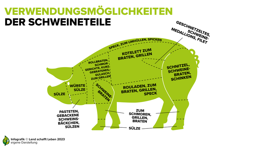 Der Schlögel besteht aus Frikandeau, Nuss, Schale, Schlussbraten, hintere Stelze und Fuß. Dementsprechend hat er verschiedene Verwendungszwecke. Das Karree ist ebenfalls vielseitig einsetzbar, vom Schweinsbraten übers Schnitzel bis zum Kotelett fürs Grillen. Das Filet oder der Lungenbraten gilt in Mitteleuropa als eines der zartesten, edelsten und teuersten Teile des Schweins. Der Schopfbraten besteht aus dem Nackenmuskel. Es empfiehlt sich, den Schopfbraten als Ganzen zu braten. Brust- und Bauchfleisch sind stark durchzogen und haben ebenfalls einen hohen Fettanteil. Sie werden als Spare Ribs (Ripperl) verzehrt, in Teilstücken als Bauchfleisch gebraten oder zu Speck verarbeitet. Der Kopf, ohne Augen, Zunge, Hirn und Schlund wird vor allem für Sülze und Wurstwaren verwendet. Die Schulter eignet sich hervorragend für den klassischen Schweinsbraten mit einer dicken Kruste. Die Stelze wird gegrillt, gebraten, geschmort oder gekocht. Der vordere Fuß enthält wenig Muskelfleisch. Er ist ein typisches Teil für den Export nach Asien. Dort wird der vordere Fuß als Delikatesse geschätzt. Insgesamt wird etwa die Hälfte des österreichischen Schweins exportiert.
