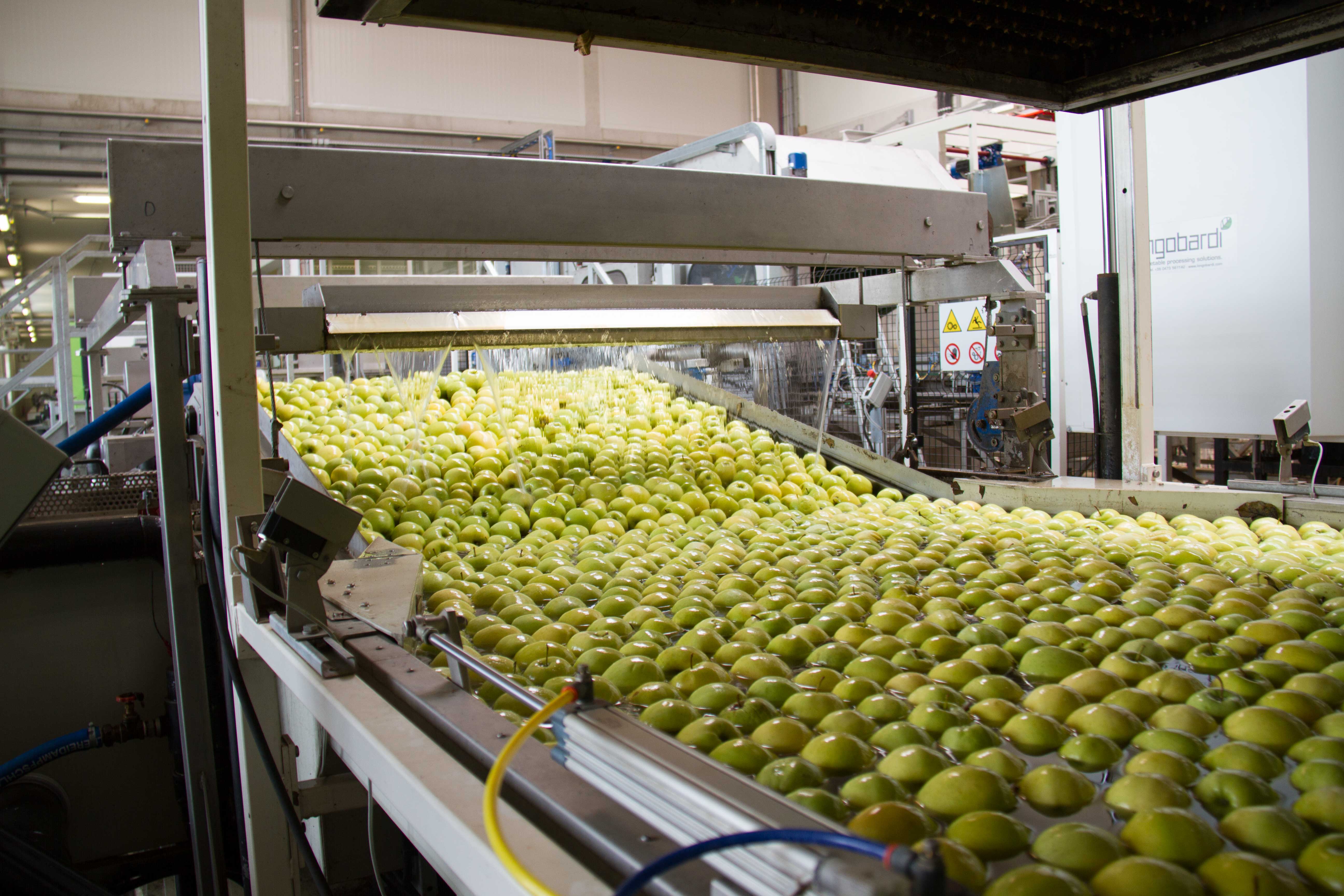 Die Äpfel werden vor dem Sortieren gewaschen. Eine Wasserstraße transportiert sie zur Sortierung. / © Land schafft Leben, 2016