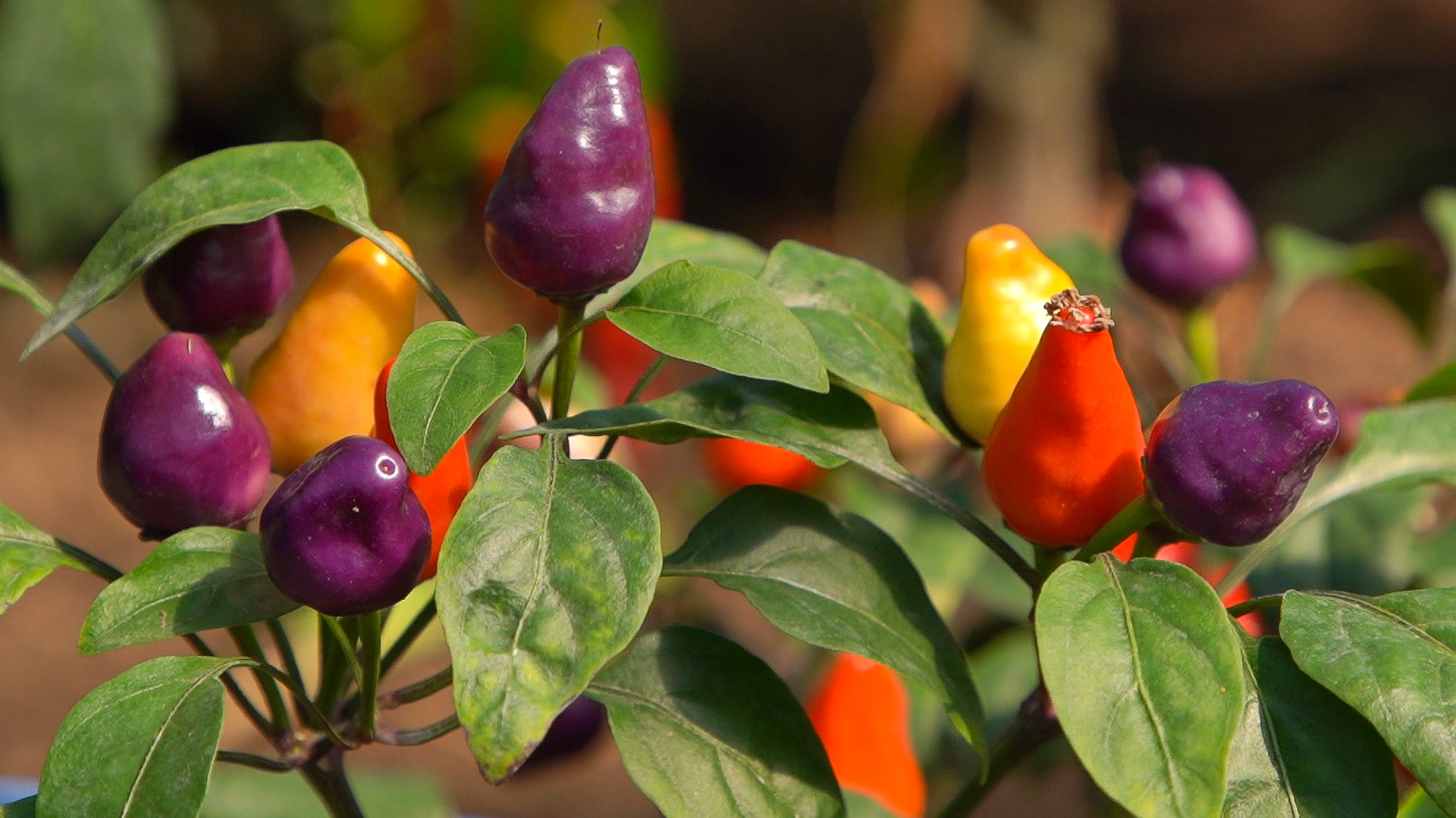 Eine große Vielfalt zeichnet den Paprika aus. Denn auch Chili und Pfefferoni zählen zu den Paprika. Der 5-färbige Chinesische Chili ist in Österreich nur selten zu finden. Er reift am Strauch, von lila über gelb und orange nach rot. / @ Land schafft Leben, 2020