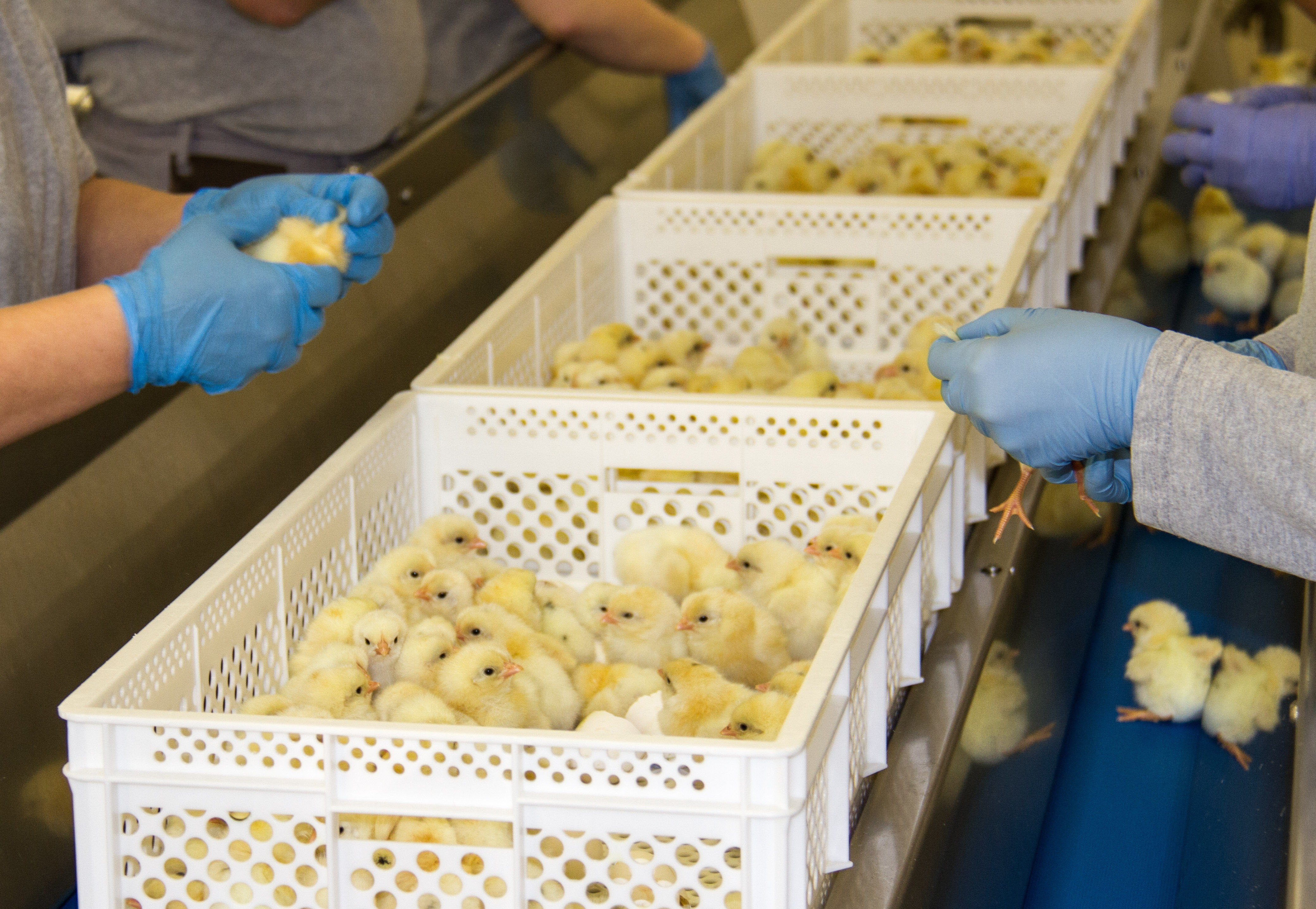 Die Küken werden am Tag des Schlüpfens mit Förderbändern von einer Station zur nächsten transportiert. Die Hälfte der Küken ist männlich, die Hälfte weiblich. Mitarbeiter der Brüterei sortieren die männlichen Küken aus. © Land schafft Leben, 2021