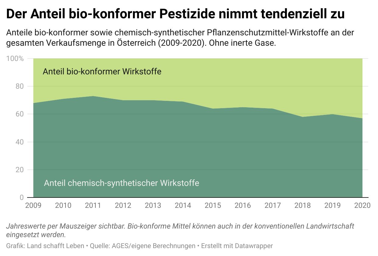 Infografik: Der Anteil bio-konformer Pestizide nimmt tendenziell zu (c) Land schafft Leben, 2022