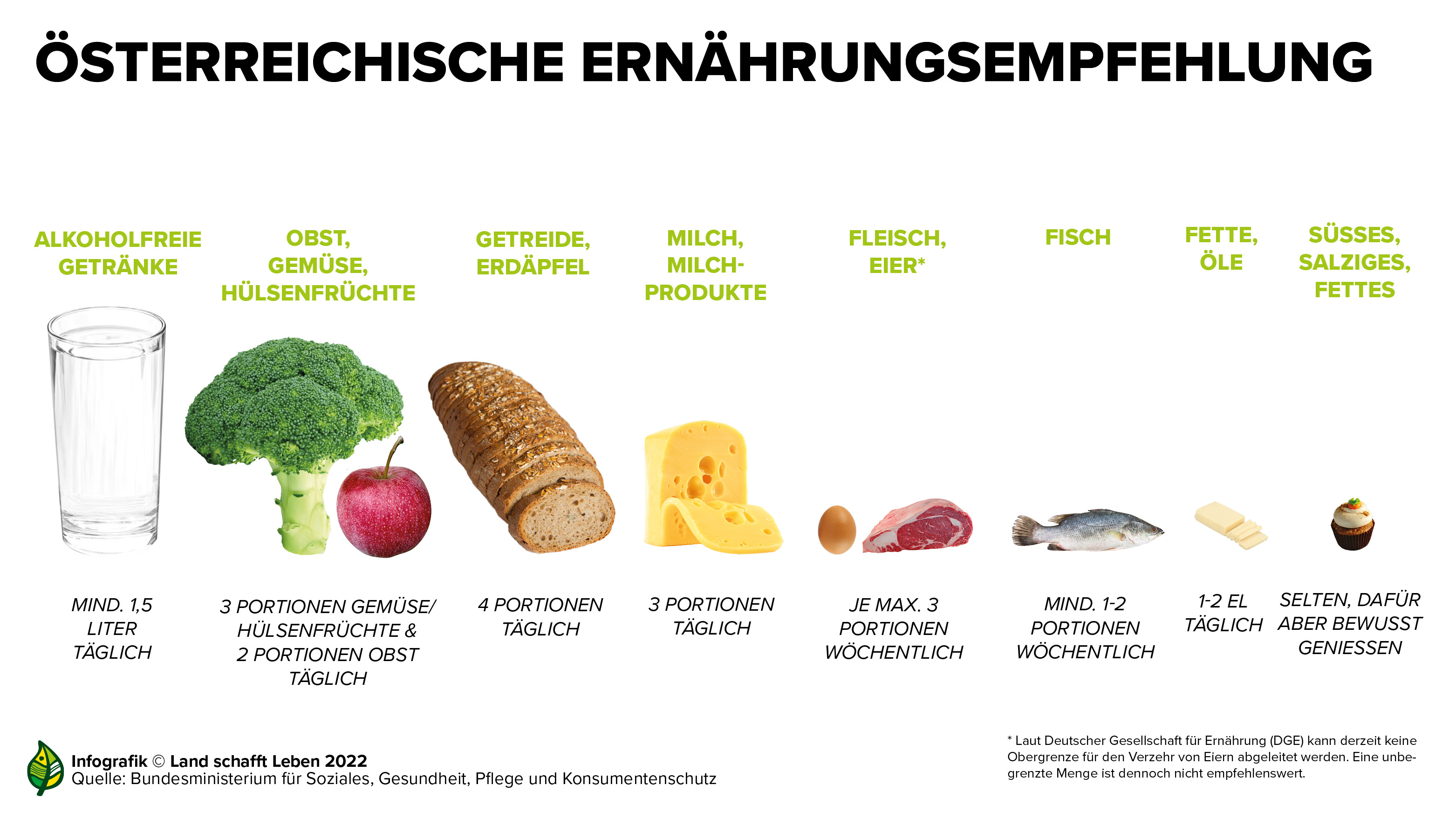 Die Österreichische Ernährungspyramide, hier in anderer Form dargestellt, listet auf, in welchen Mengen bestimmte Lebensmittelgruppen auf dem Speiseplan stehen sollten. (c) Land schafft Leben, 2022