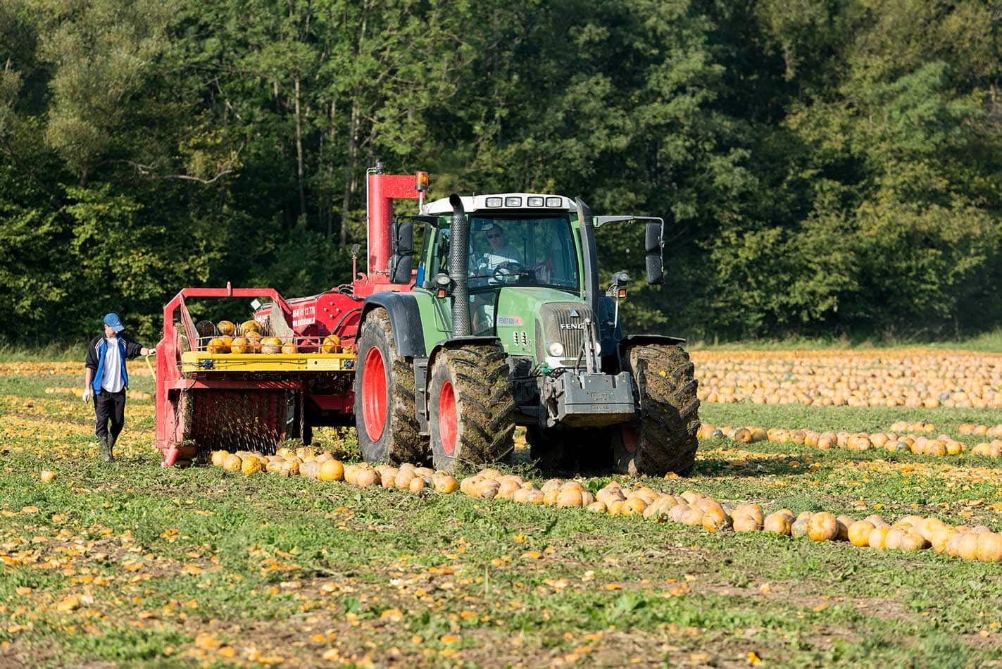 Ölkürbisse werden in Reihen geschoben und geerntet. © Stefan Kristoferitsch