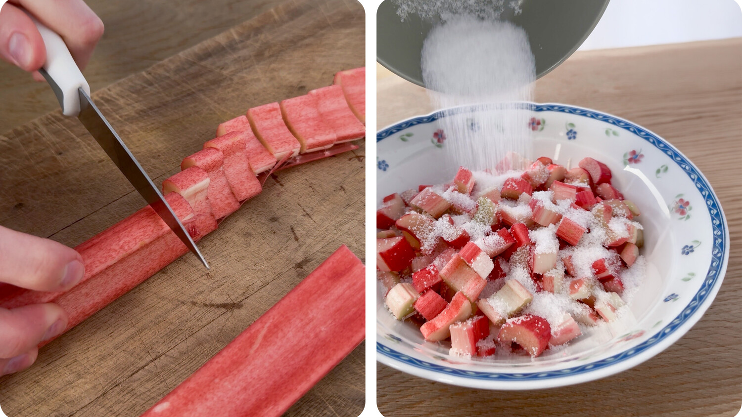 - Die Rhabarberstangen gut waschen, Blätter und Enden abschneiden. Bei besonders faserigen Stielen die Fäden abziehen. Die Rhabarberstangen in ca. 2 cm breite Stücke schneiden, in einer Schüssel mit Zucker vermengen und für ca. 30 Minuten ziehen lassen.