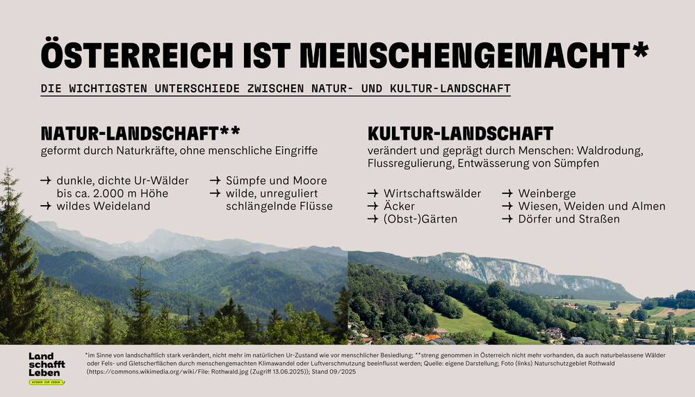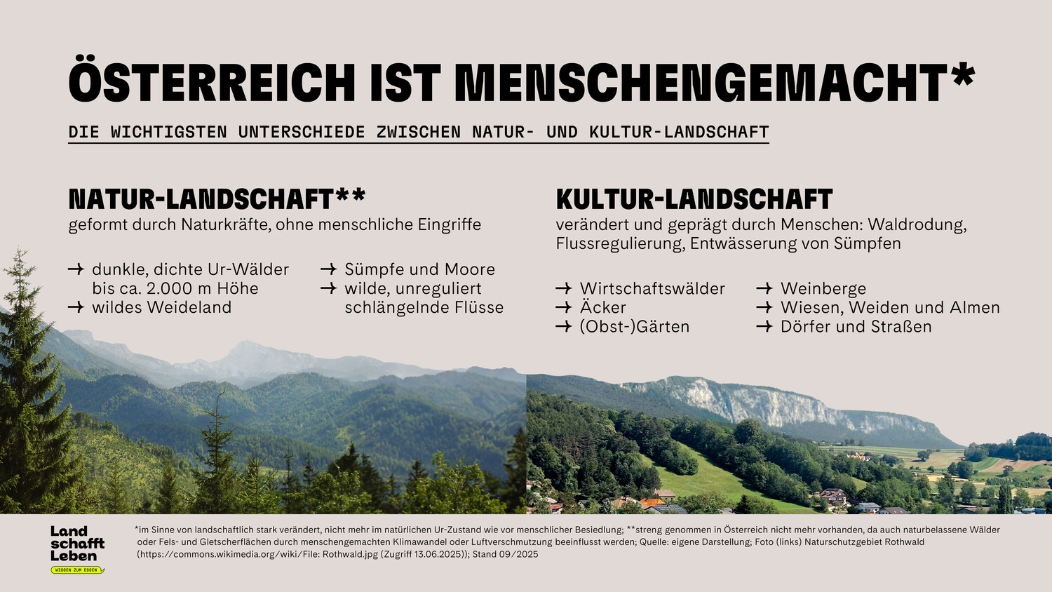 Das Wichtigste zu Beginn: Wenn wir umgangssprachlich von der schönen „Natur“ in Österreich sprechen, dann meinen wir eigentlich die „Kulturlandschaft“. Denn die österreichische Landschaft ist menschengemacht. Vor 8.000 Jahren gab es hier hauptsächlich dichte Wälder und vergleichsweise wenig Offenland. Das Aufkommen der Landwirtschaft sorgte dafür, dass die Flächen bewirtschaftet wurden. Wälder wurden gerodet, Sümpfe trockengelegt und Äcker und Weiden geschaffen – so veränderte sich das Gesicht Österreichs zu dem, was wir heute kennen.