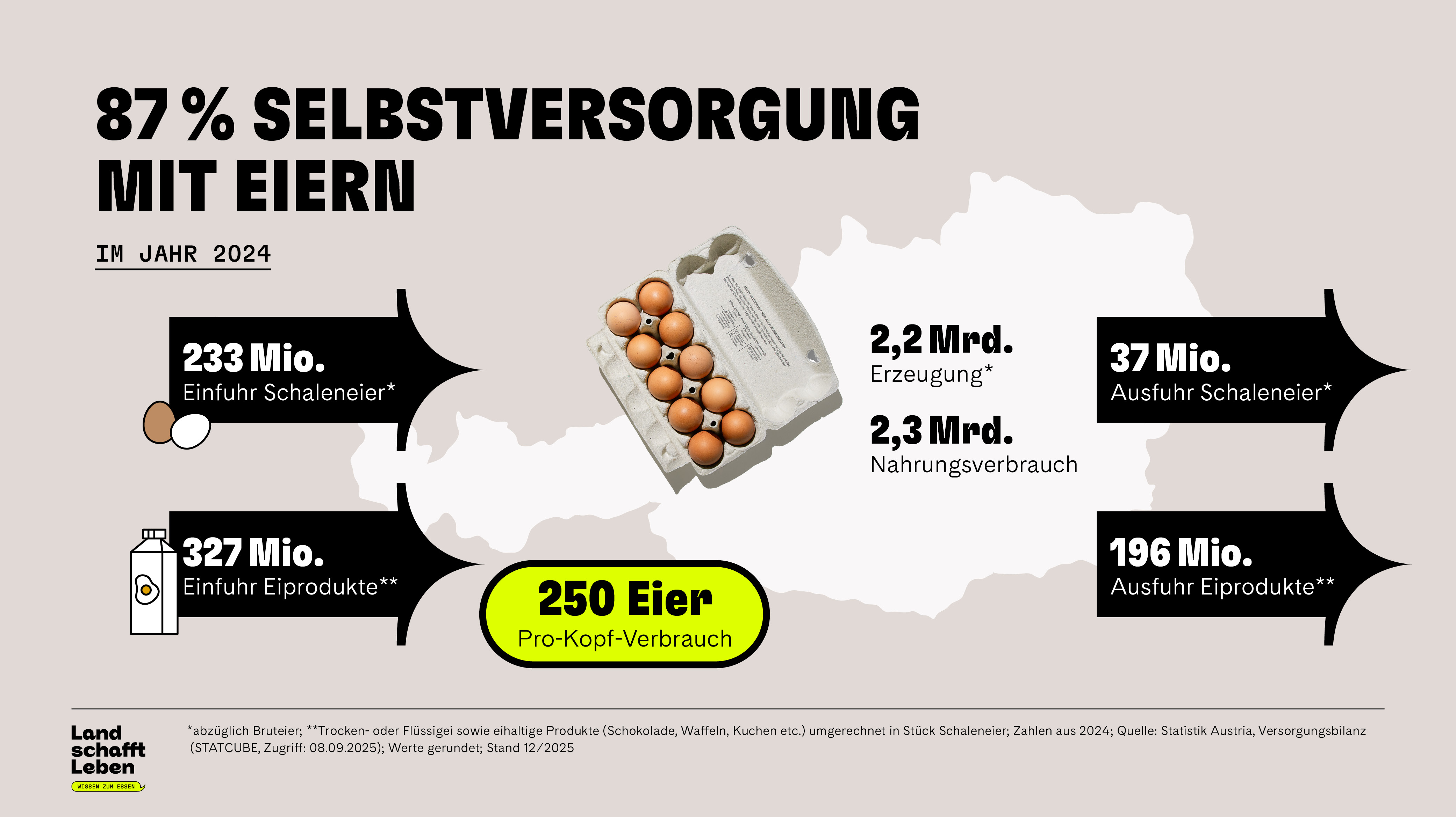 Österreich kann den eigenen Bedarf mit etwa 2,2 Milliarden produzierten Eiern pro Jahr fast selbst decken – Der Selbstversorgungsgrad beträgt rund 90 Prozent. Eier werden hierzulande unter hohen Tierwohlstandards produziert – oft im Gegensatz zu günstiger, ausländischer Ware. Jegliche Form der Käfighaltung ist in Österreich seit 2020 verboten, der Import von Käfigeiern allerdings nicht. Täglich importiert Österreich 1,5 Millionen Eier – größtenteils aus Deutschland, was aber nicht heißen muss, dass die Eier von deutschen Hennen gelegt wurden. Grund dafür sind Re-Exporte: Beispielsweise importiert Deutschland Eier aus der Ukraine und exportiert sie dann weiter, etwa für den Großhandel oder in Form verarbeiteter Lebensmittel wie Kuchen, Nudeln oder Mayonnaise. Als Herkunftsland ist also trotzdem Deutschland angegeben.