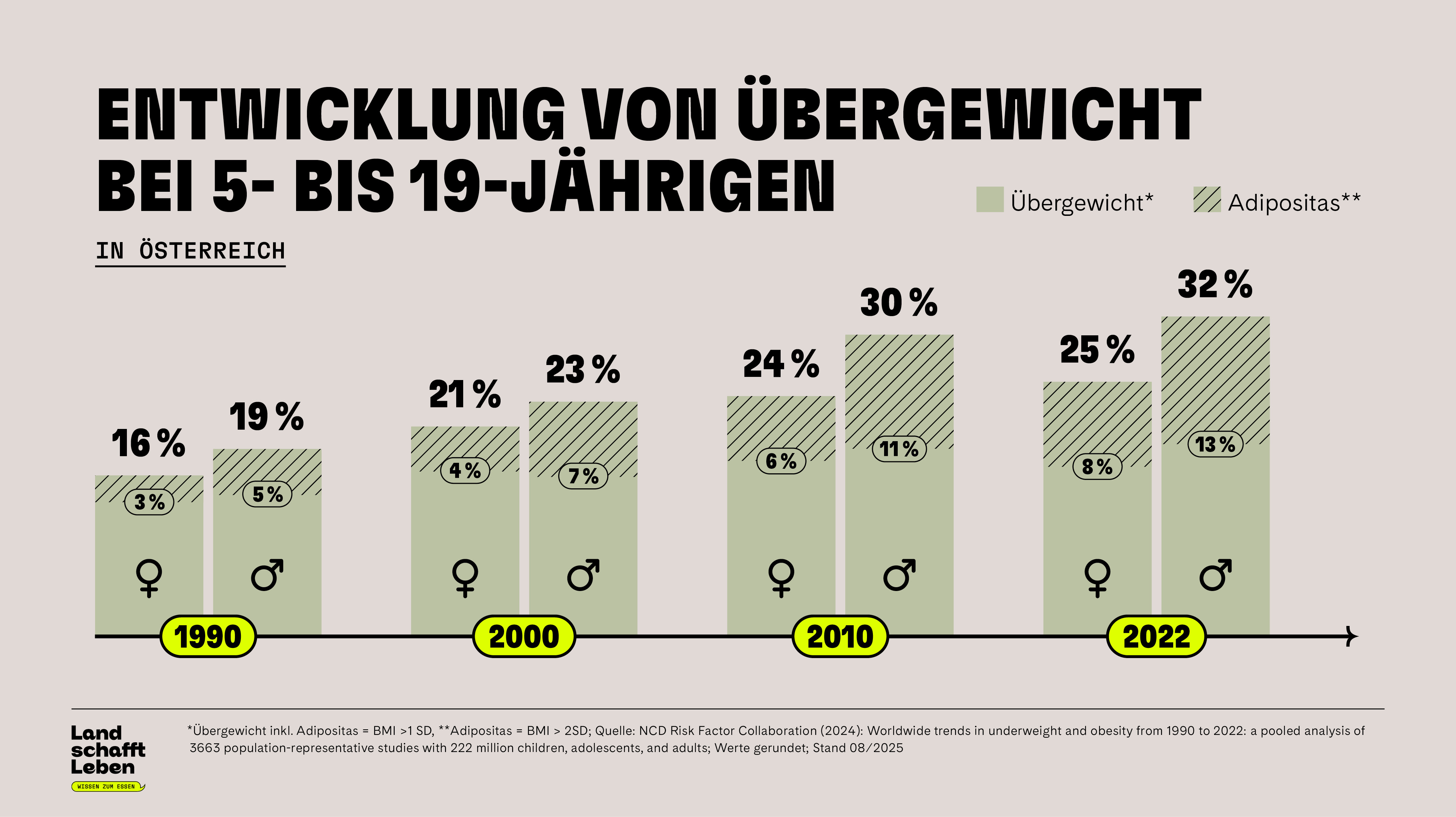 Ein Drittel der Kinder und Jugendlichen in Österreich ist übergewichtig, bei den Erwachsenen sind es etwas mehr als die Hälfte – Tendenz steigend. Diese Entwicklung hat gesundheitliche Auswirkungen, denn Übergewicht und Adipositas erhöhen etwa das Risiko für Herz-Kreislauf-Erkrankungen, Diabetes oder bestimmte Krebsarten. Laut des Instituts für Höhere Studien werden die gesamtwirtschaftlichen Kosten von Adipositas in Österreich auf rund 2,4 Milliarden Euro pro Jahr geschätzt. Zudem lag Österreich laut Eurostat 2023 bei einem Europa-Vergleich der gesunden Lebensjahre lediglich im unteren Drittel. Maria Fanninger, Gründerin von Land schafft Leben, zeigt auf: „Österreich ist im Spitzenfeld jener Länder in Europa mit den höchsten Pro-Kopf-Gesundheitsausgaben. Gezielt in Präventionsmaßnahmen wie Ernährungs- und Gesundheitsbildung zu investieren, reduziert Millionen von Euro an Gesundheitskosten.“