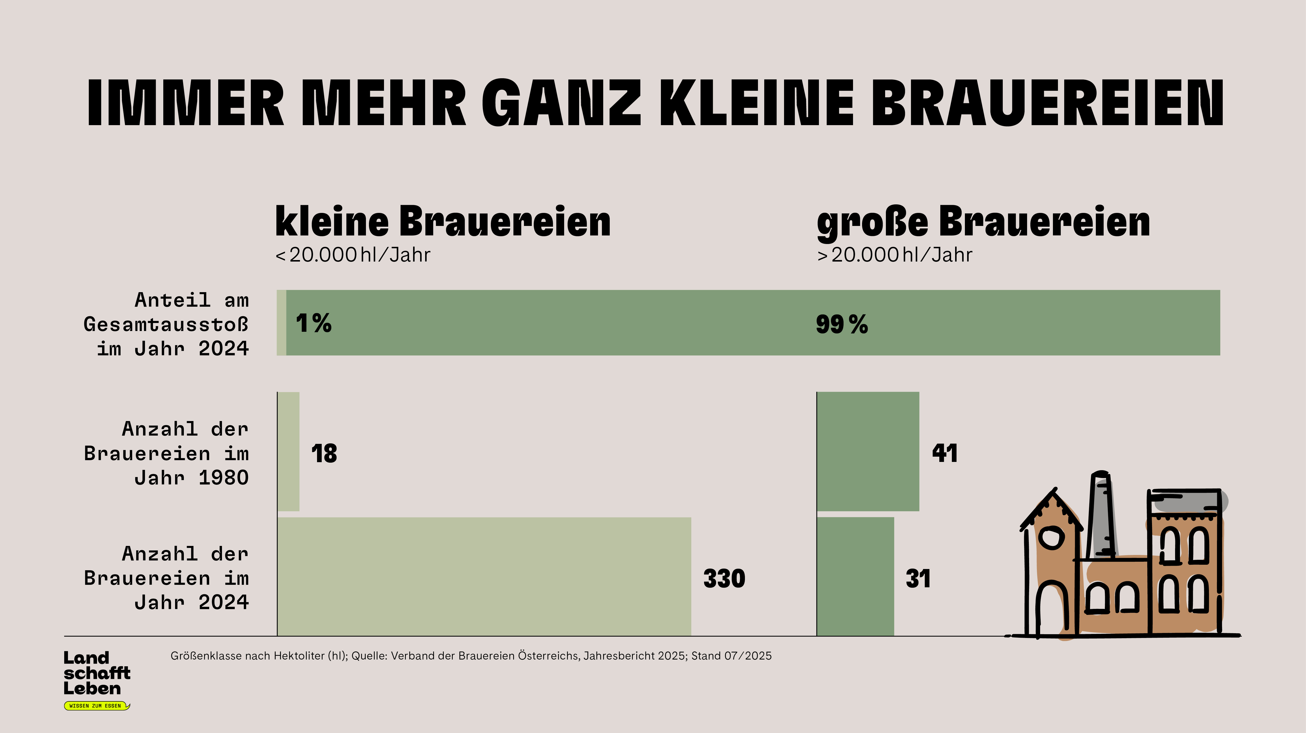 Die österreichische Bierlandschaft ist zweigeteilt: Annähernd zwei Drittel des Bieres, das in Österreich getrunken wird, stammen von Brauereien, die Teil eines internationalen Konzerns sind. Rund ein Drittel stellen Brauereien in der Hand eigenständiger Unternehmen her. Deren Anzahl, aber auch die Biervielfalt insgesamt sowie die Nachfrage nach regionalen Spezialitäten und Kreativbieren ist in den vergangenen Jahren stark gestiegen. Heiße, trockene Sommer stellen alle Brauereien vor Herausforderungen: Für die erfolgreiche Bierproduktion aus österreichischen Rohstoffen sind Qualität und Erntemenge der Braugerste entscheidend.