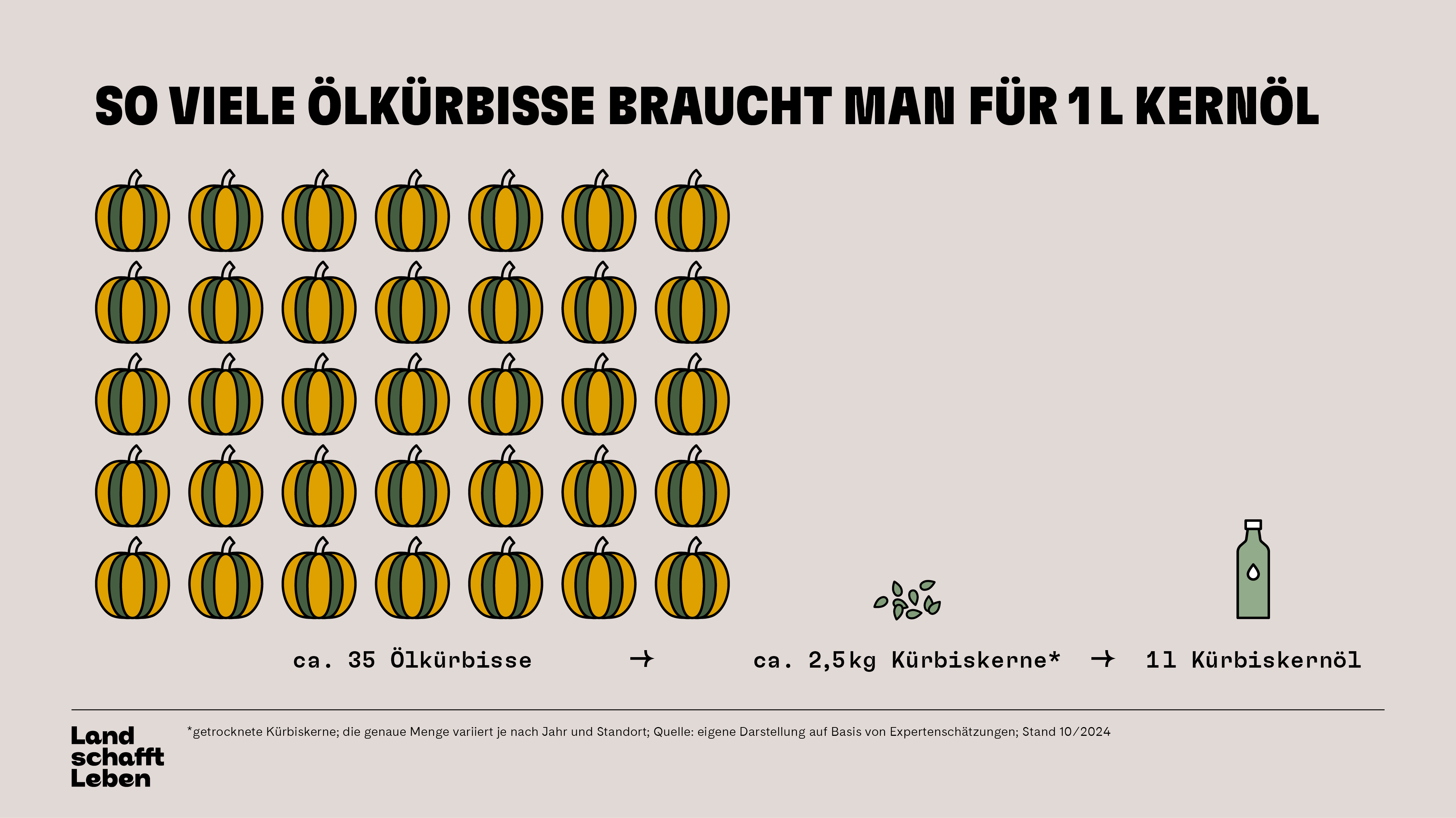 Fast die Hälfte des Steirischen Kürbiskernöls geht ins Ausland. Das streng kontrollierte Regionalprodukt überzeugt international durch eine enge Zusammenarbeit zwischen Landwirtschaft und verarbeitenden Betrieben, so der Verein Land schafft Leben.