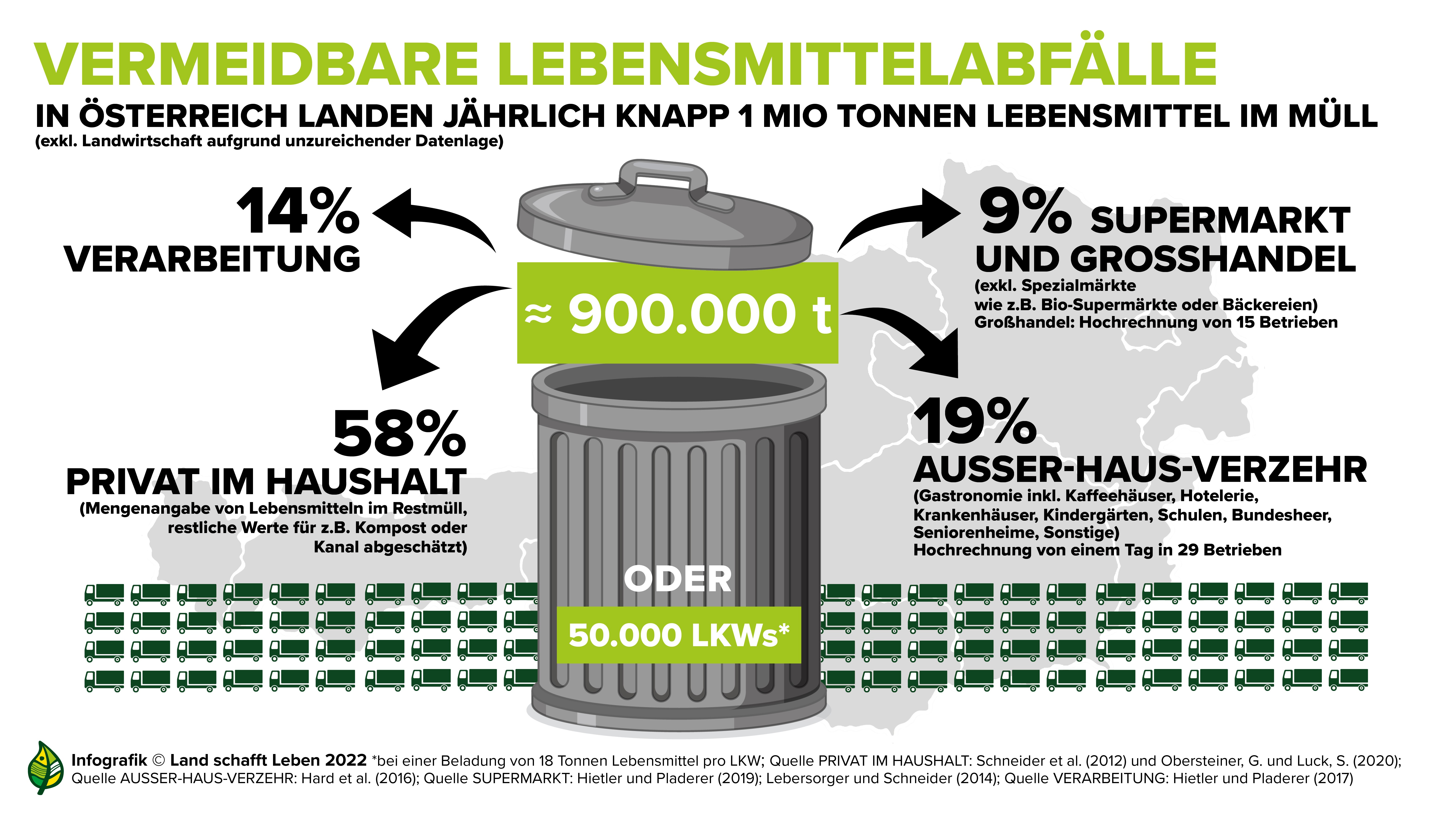 Rund eine Million Tonnen Lebensmittel landen in Österreich jedes Jahr im Müll. Würde man all diese Lebensmittel in LKWs laden und aneinanderreihen, ergäbe dies einen durchgehenden Stau von Wien bis nach Zürich. Weit mehr als die Hälfte der Fahrzeuge wären dabei mit Essen beladen, das in den privaten Haushalten weggeworfen worden ist. Hier passieren 58 Prozent der gesamten Lebensmittelverschwendung in Österreich. Brot und Gebäck sind jene Lebensmittelgruppe, von der am meisten entsorgt wird. Hannes Royer, Gründer des Vereins Land schafft Leben, sagt dazu: