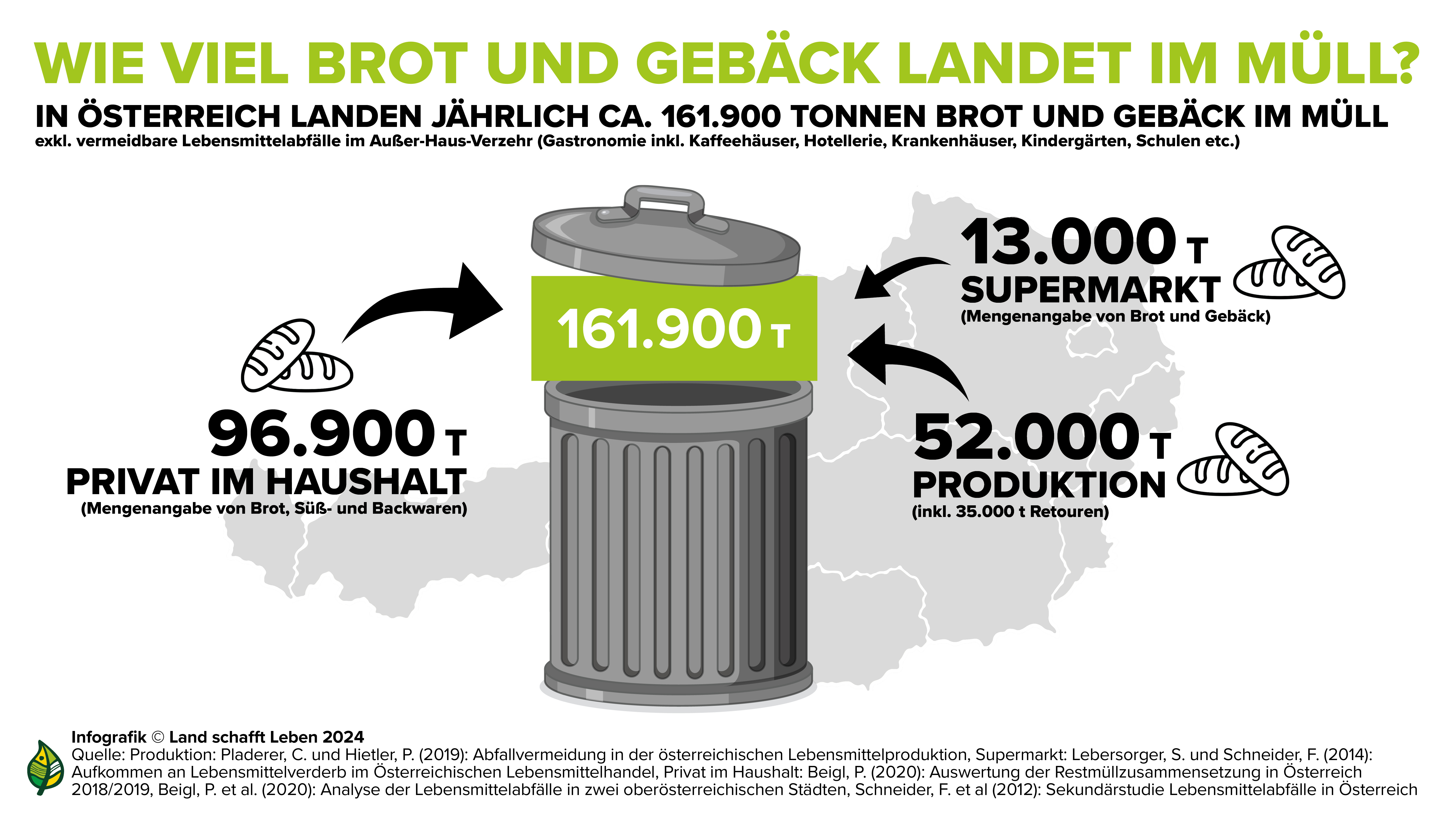 Fast 100.000 Tonnen Brot und Gebäck werden in Österreichs Privathaushalten pro Jahr entsorgt. Das entspricht etwa 18 Kilogramm an verschwendetem Brot pro Person. Geht man von einem durchschnittlichen Gewicht pro Laib von 500 Gramm aus, sind das 36 Laibe. Zusätzlich werden in Bäckereien pro Jahr rund 52.000 Tonnen Backwaren entsorgt. Gründe dafür sind unter anderem Überproduktion und Produktionsfehler. Supermärkte verschwenden pro Jahr rund 13.000 Tonnen Brot und Gebäck – unter anderem, weil hier teilweise mehr aufgebacken wird, als benötigt.