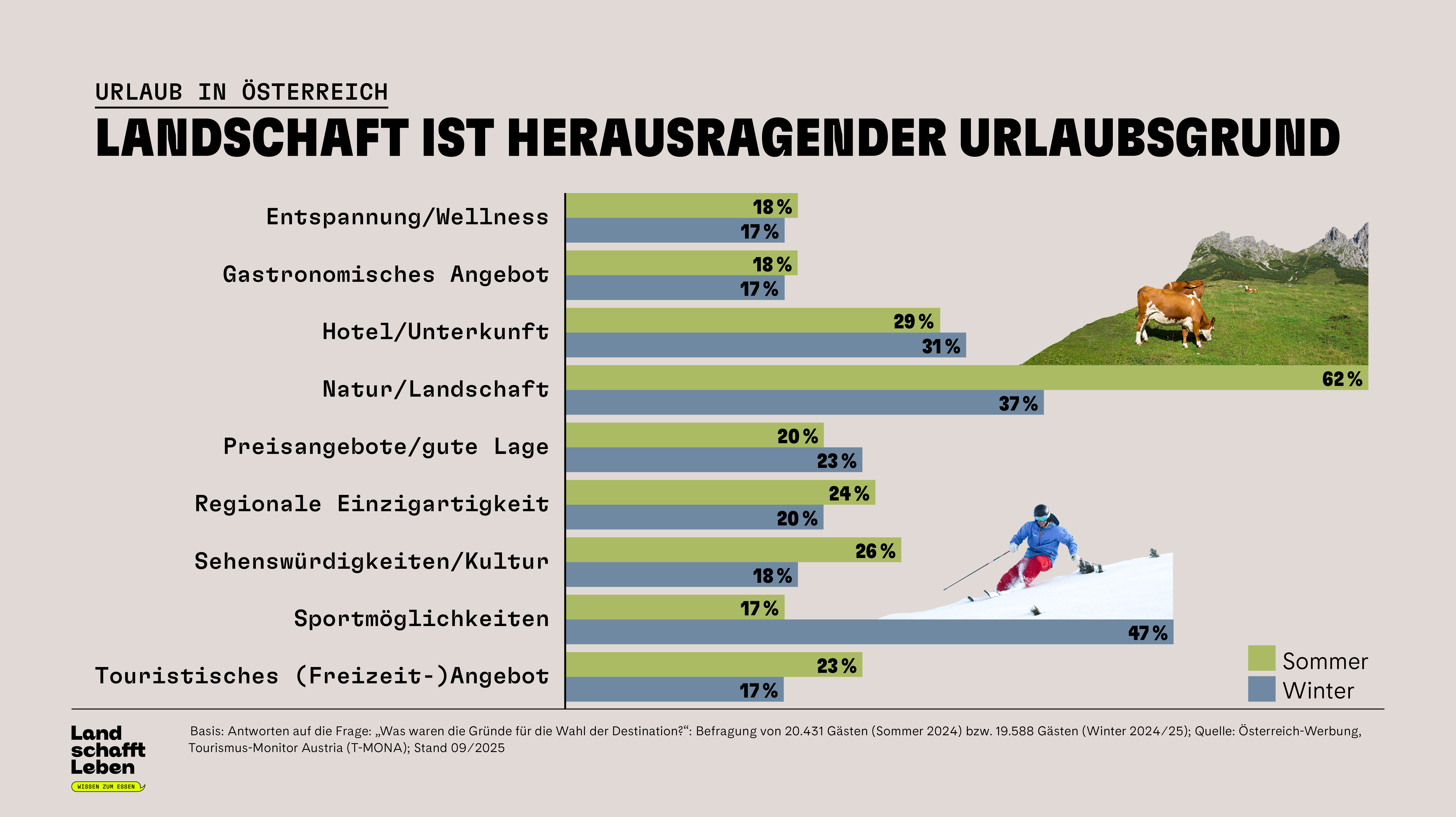 Land schafft Leben hat sich zum Ziel gesetzt, das Thema in den kommenden zwei Jahren in den Mittelpunkt seiner Aktivitäten zu stellen. Der Report „Landwirtschaft, Lebensraum & Tourismus“ stellt die Grundlage dafür da. Er beleuchtet unter anderem die Entstehung der Kulturlandschaft, die Geschichte des Tourismus, die vielfältigen Leistungen der Almwirtschaft und den Mehrwert, den der Tourismus für die Landwirtschaft bringt. Der Report steht in ersten Teilen zum Download auf www.landschafftleben.at bereit.