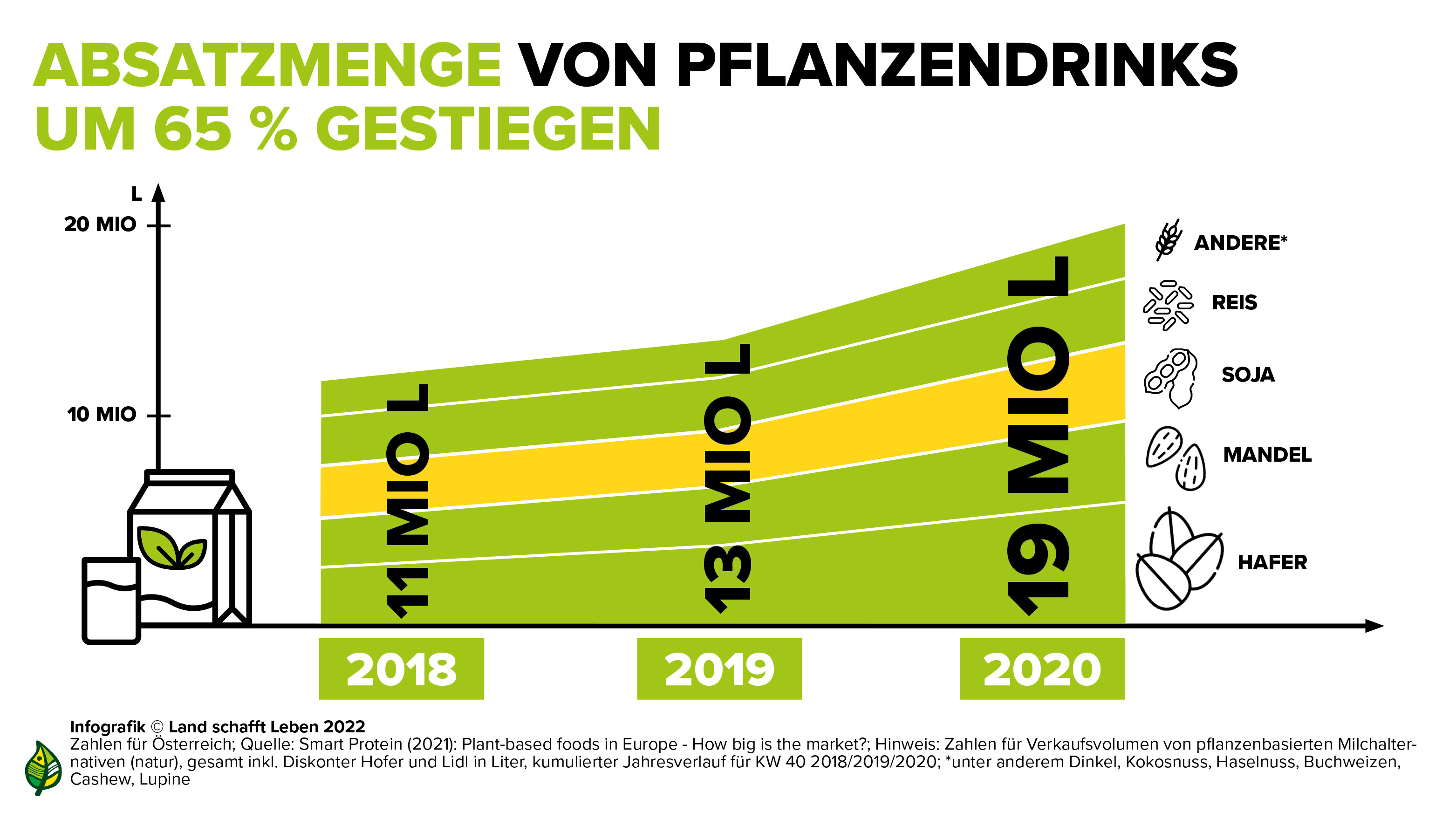 Ganz allgemein lässt sich in Österreich ein Trend zu pflanzenbasierten Lebensmitteln feststellen, unter anderem zu pflanzlichen Drinks. Von 2018 auf 2020 ist die insgesamt verkaufte Menge um ganze 65 Prozent gestiegen, und zwar von elf auf 19 Millionen Liter. Hier spielt Soja eine große Rolle: 2020 machten Soja- und Mandeldrinks jeweils rund 3,7 Millionen Liter an der verkauften Gesamtmenge von Drinks auf Pflanzenbasis aus. Größer ist nur der Anteil von Haferdrinks mit rund 5,7 Millionen Litern. Bei Pflanzendrinks, die mit Geschmack versehen sind, hat Soja jedoch eindeutig die Nase vorne.