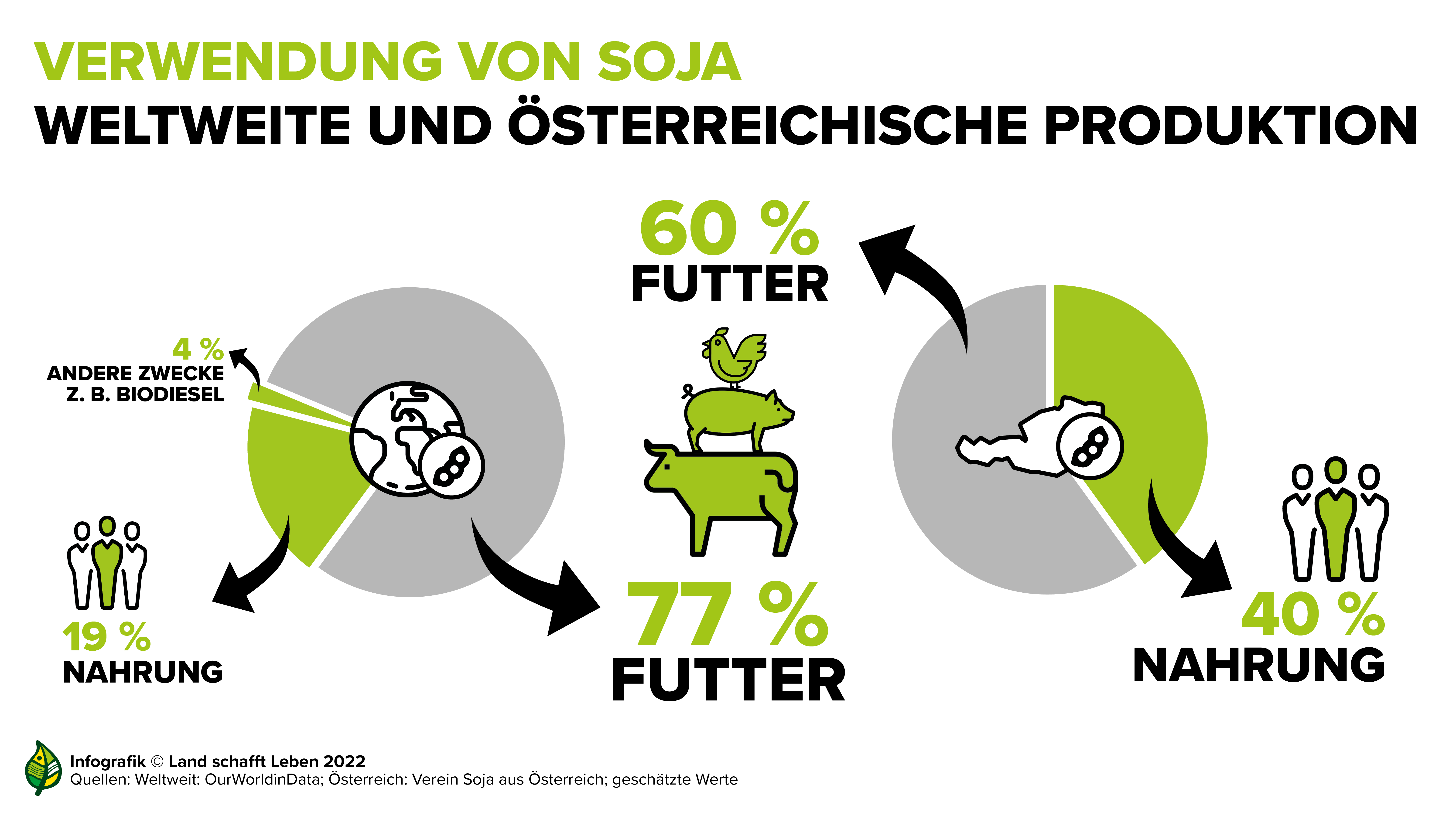 Am Ende werden rund 40 Prozent des heimischen Sojas zu Lebensmitteln weiterverarbeitet. Die anderen 60 Prozent werden an Nutztiere verfüttert. Den restlichen Bedarf an Futtermittel-Soja importiert Österreich vor allem aus Übersee.